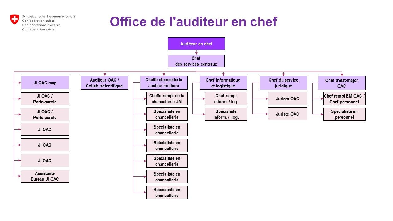 L'Office de l'auditeur en chef est l'organisation d'état-major de la Justice militaire. Il veille à ce que les plus de 400 membres de la Justice militaire puissent exercer leur fonction de juge d'instruction, d'auditeur, de président ou de greffier, etc. de manière compétente et efficace.