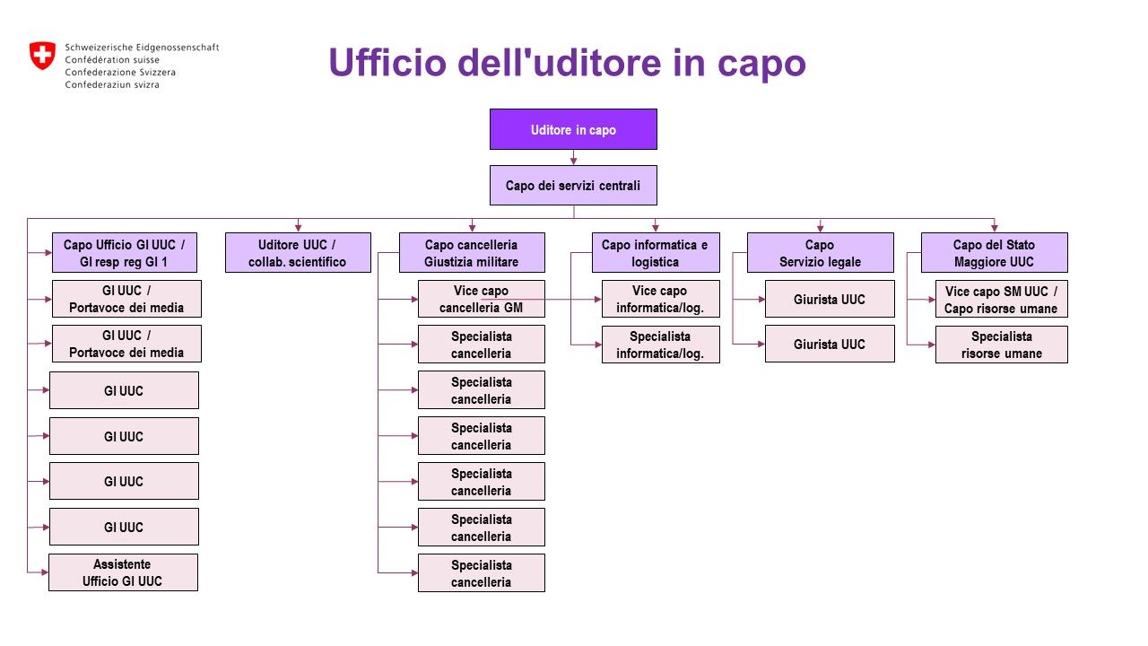L'Ufficio dell'uditore in capo è l'organizzazione del Stato maggiore della Giustizia militare. Garantisce che gli oltre 400 membri ddella Giustizia militare possano svolgere la loro funzione di giudici istruttori, uditori, presidenti o segretari, ecc. in modo competente ed efficiente.
